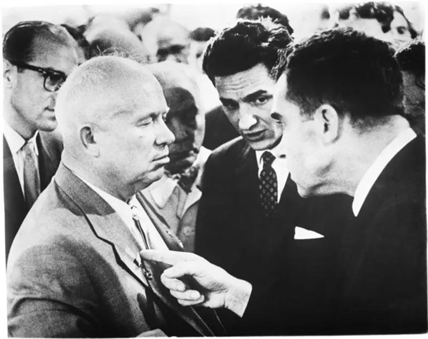 У другому пості слів немає, є лише дві фотографії поруч. Відома фотографія 1959 року з американської виставки в Москві, на якій Річард Ніксон (тоді віцепрезидент) тицьнув пальцем у радянського лідера Микиту Хрущова. Вона відома як “кухонні дебати” (Ніксон тоді доводив, що в США представлені на виставці електробитові прилади доступні масовому споживачу, про що радянські люди могли лише мріяти).