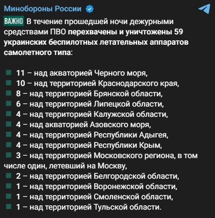 Міноборони Росії заявила про нічну атаку дронів і стверджує, що російська ППО за ніч нібито “знешкодила 59 українських безпілотників”. Про це російське відомство написало на своєму Telegram-каналі.